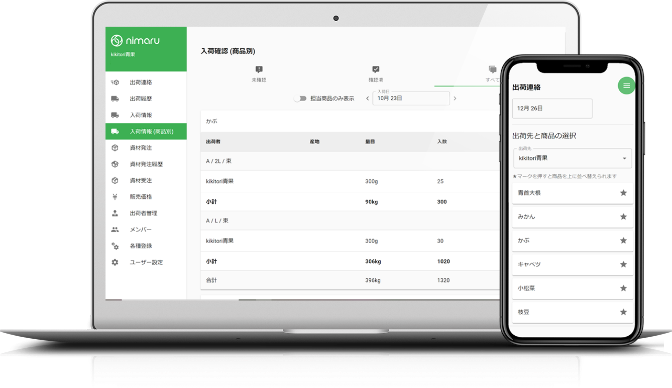 青果流通は市場流通と直接流通の2パターンに分けることが出来ますが、nimaruはそのうち8割を占める市場流通側のDXを進めるSaaSです。