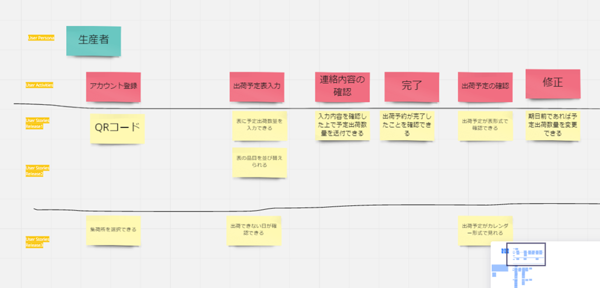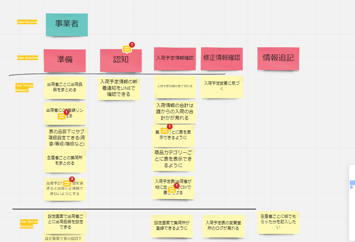 プロジェクト当初に徹底的にユーザーに向き合い、深く共感できたことはデザイナーである私にとって大きな収穫でした。課題解決の提案が広がり、よりPDCAサイクルをスムーズに進めることが出来るからです。私たちは、KPIを達成し出荷者と流通事業者のそれぞれが課題を解決するにあたって必要なユーザーストーリーをまとめ、プロダクトの全体像をチーム内で共有することにしました。