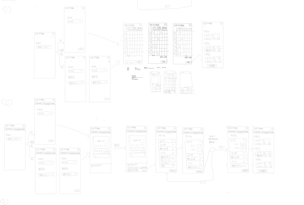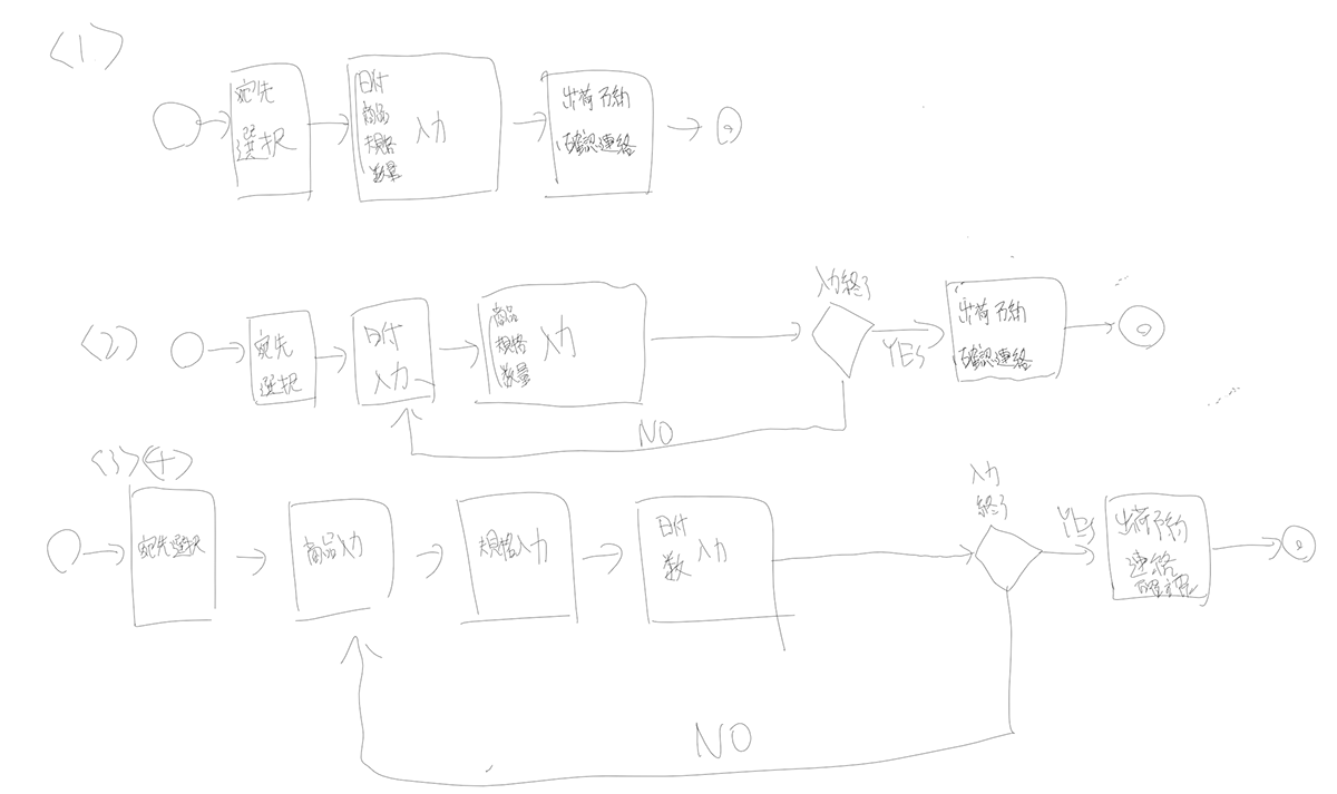重要なユーザーストーリーから順に、それに関係する情報構造上やレイアウト上の不確実性を出来るだけ早いスパンでつぶしていく必要があります。ボタンや色など表層部分の検討するのは後です。そのために「出荷者は1週間分の出荷予約を連絡できる」「流通事業者は1週間分の担当する出荷者の出荷予約を確認できる」というユーザーストーリーを叶えるにあたって考えられる画面遷移や情報構造を最低限チームメンバーに共有できるプロトタイプを作成しました。プロトタイプを複数パターンの手書きのスケッチにしたのは最低源のコストで情報構造上やレイアウト上の不確実性をつぶせるからです。