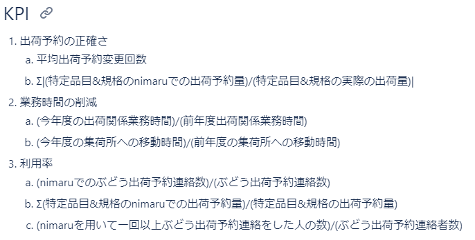 プロジェクト当初、私には青果流通現場の知識があまりなかったので、ユーザーにとって本当に役に立つプロダクト開発をこのまま進めることは難しいと感じていました。 そこで、この機能を特に欲していたJA松本ハイランドに業界と業務に関するインタビュー、そしてプロダクト開発中の定期的なヒアリングをお願いすることにしました。私とkikitoriのオーナーと二人でヒアリングを進める中で、「事前に出荷量を把握したい」という要望がなぜ強くなったのか知ることが出来ました。 JAは農家の所得を高めるべく、農家の農畜産物を集荷して数量や品質を均一にした後に、需給の動向に合わせて卸売事業者や小売事業者に有利に販売する事業を行っています。これを有利販売と言いますが、JAの最も主力な事業になります。よってKGIはJAの有利販売事業全体の利益上昇率になります。