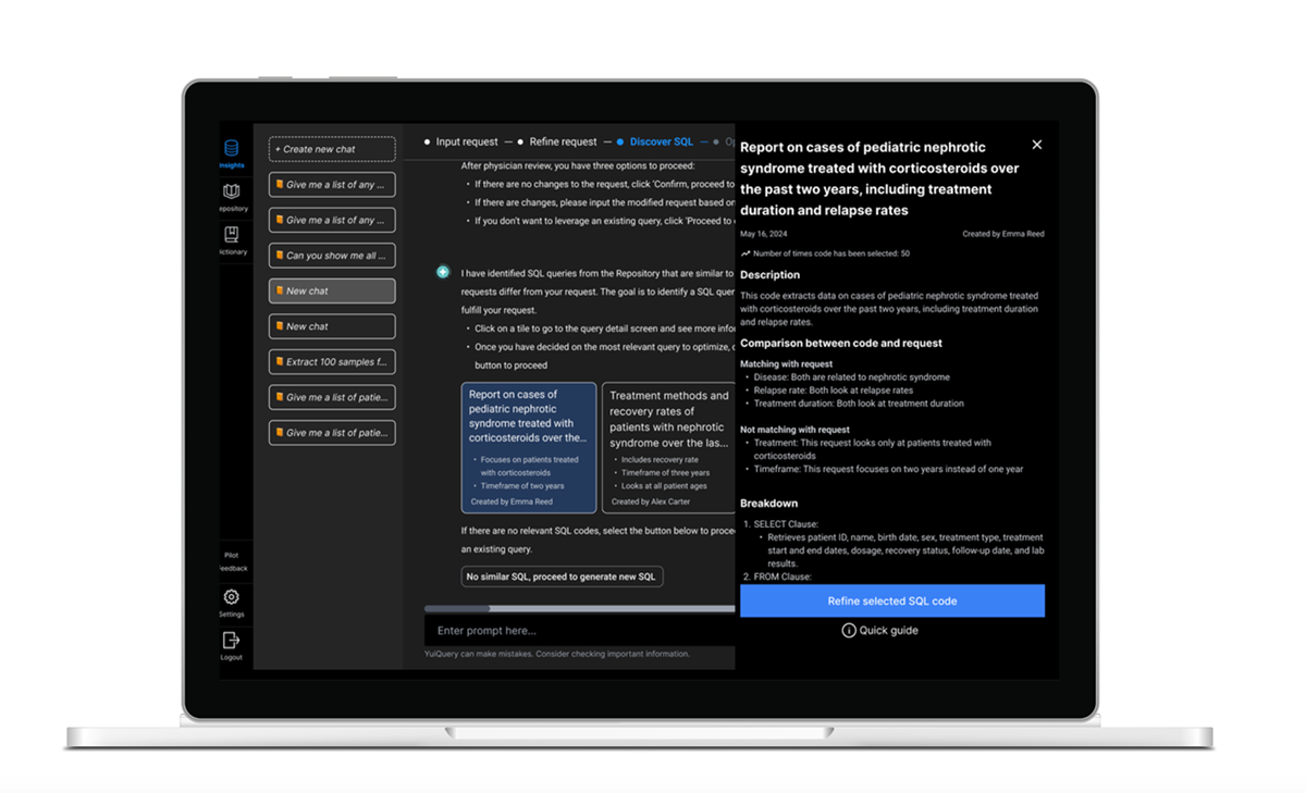 YuiQueryは、米国の医療研究者やデータサイエンティストがデータを効率的に抽出・解析できるようにAIがサポートするプロダクトです。